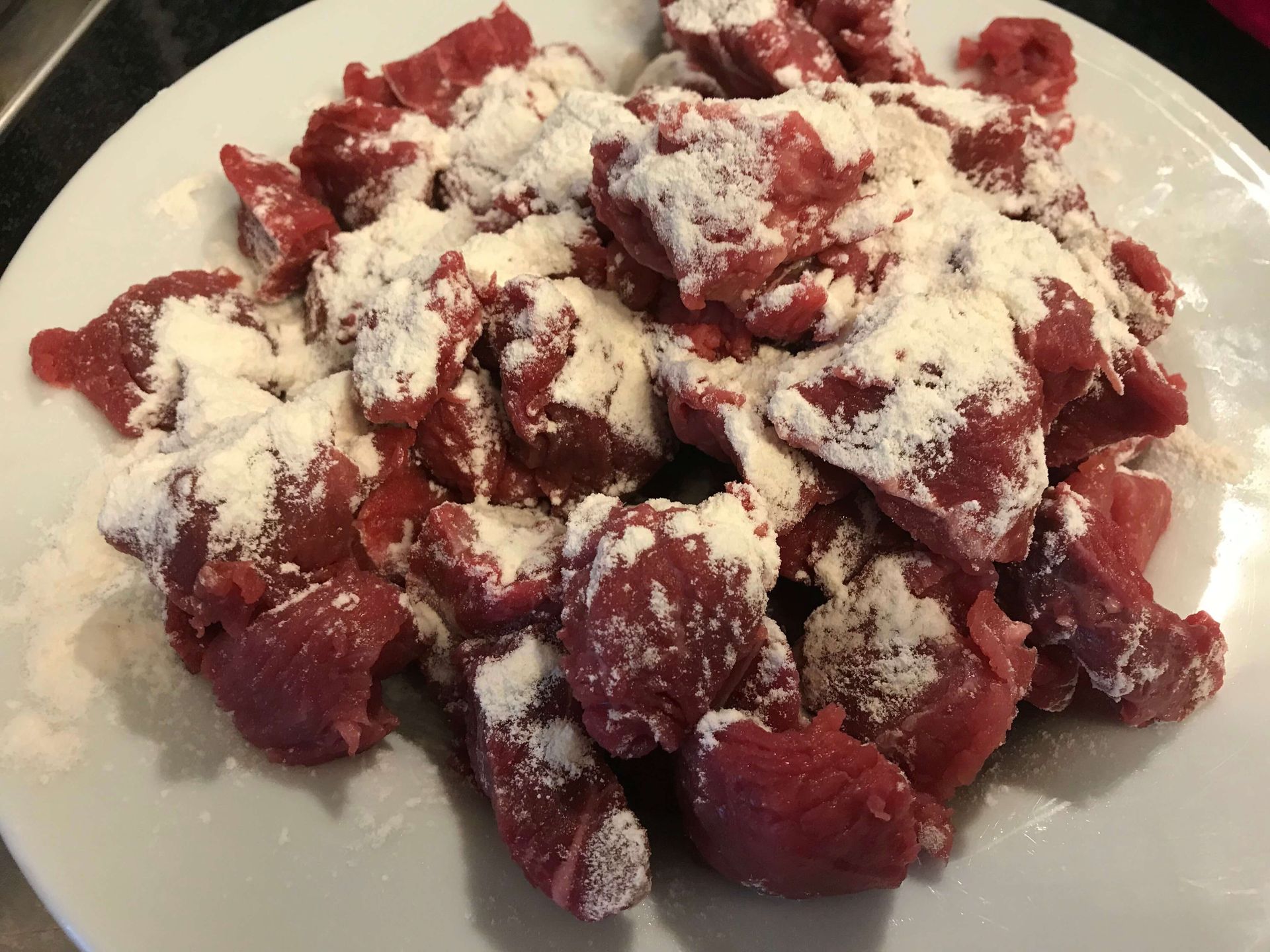 - Cortar la carne en trozos pequeños (1-2 cm) y espolvorearla con la harina.