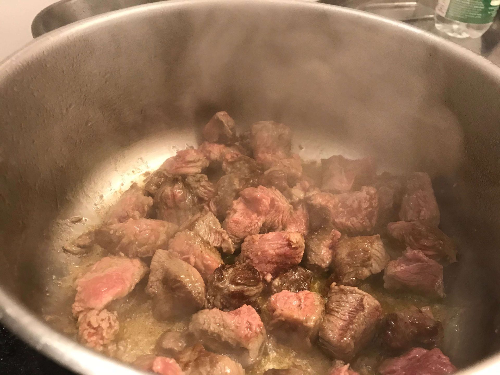 - Cuando el aceite esté caliente, añadir la carne y dorar bien por todos lados sin mover hasta que se despegue sola. Salpimentar.