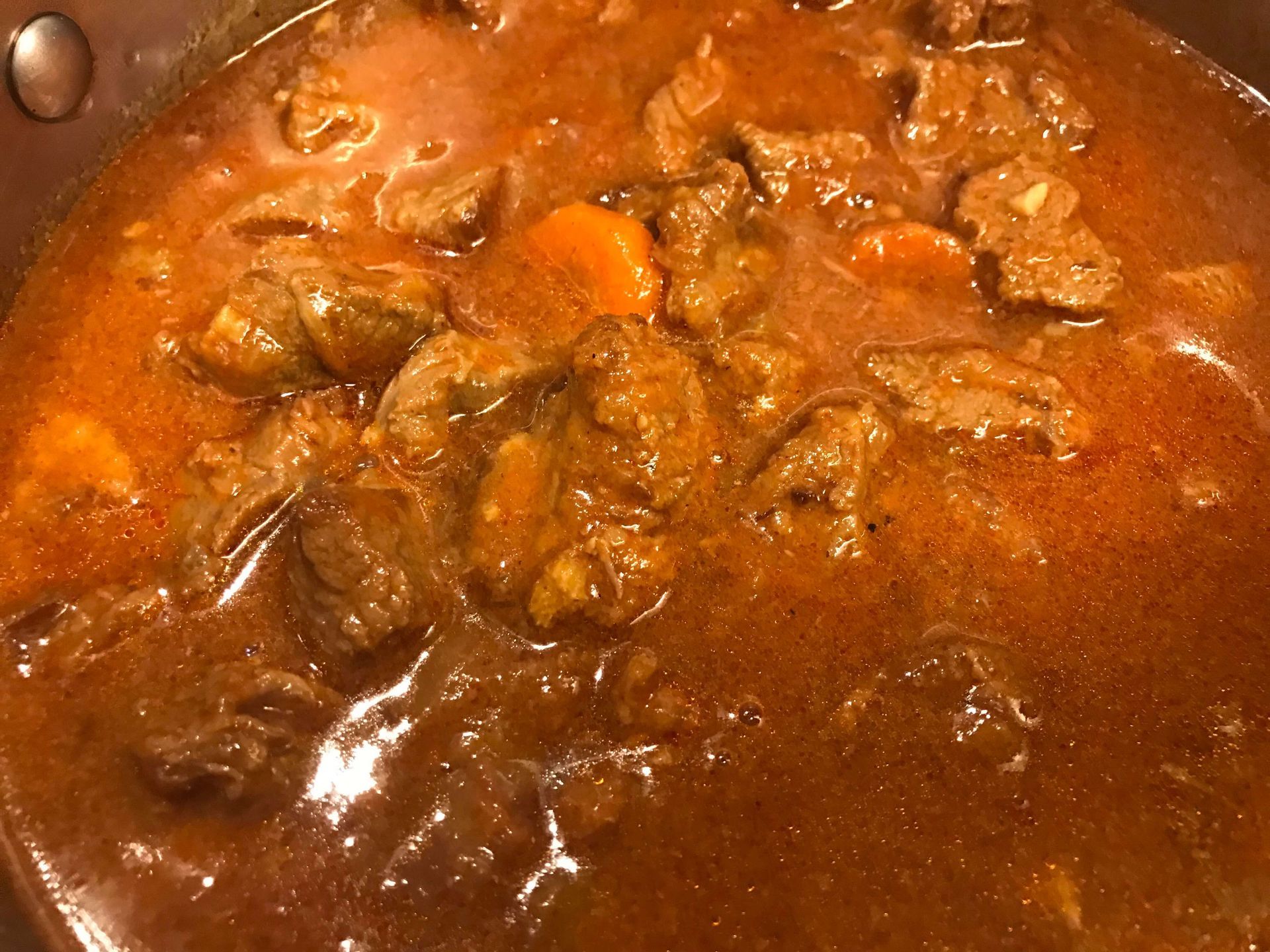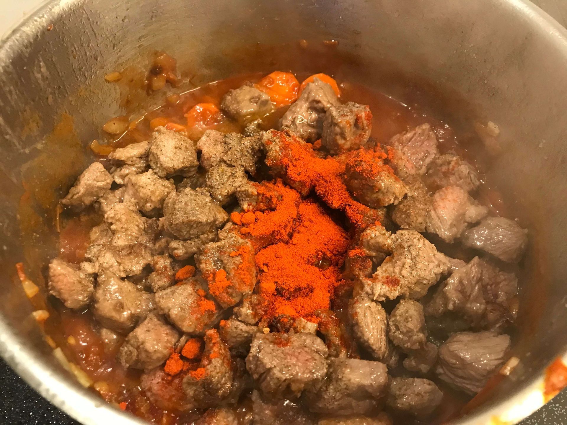 - Devolver la carne a la cacerola junto con la nuez moscada y el pimentón dulce.